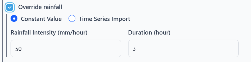 To specify your own precipitation data, you can load intensity/duration pairs, or import a csv file with time in hours and precipitation in mm/hour in the first and second column.