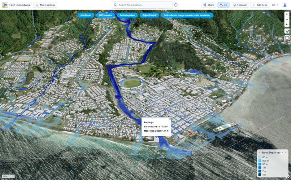 - Answer: No, this is an important distinction. The 3D buildings are for visualization and exposure analysis only; they are sourced from OpenStreetMaps. The flood simulation itself is run on the DTM (bare earth), which has had the buildings removed. This ensures the water flows correctly down streets and open terrain. The final step is to overlay the 3D building models on top of the final flood map for a realistic visualization.