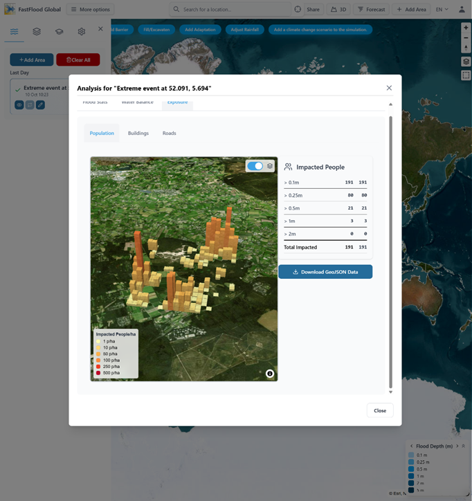 - See Impacted People: The platform can automatically analyze the flood's impact on the population, showing you a 3D map of where people are affected and at what flood depth. You get a simple table of: